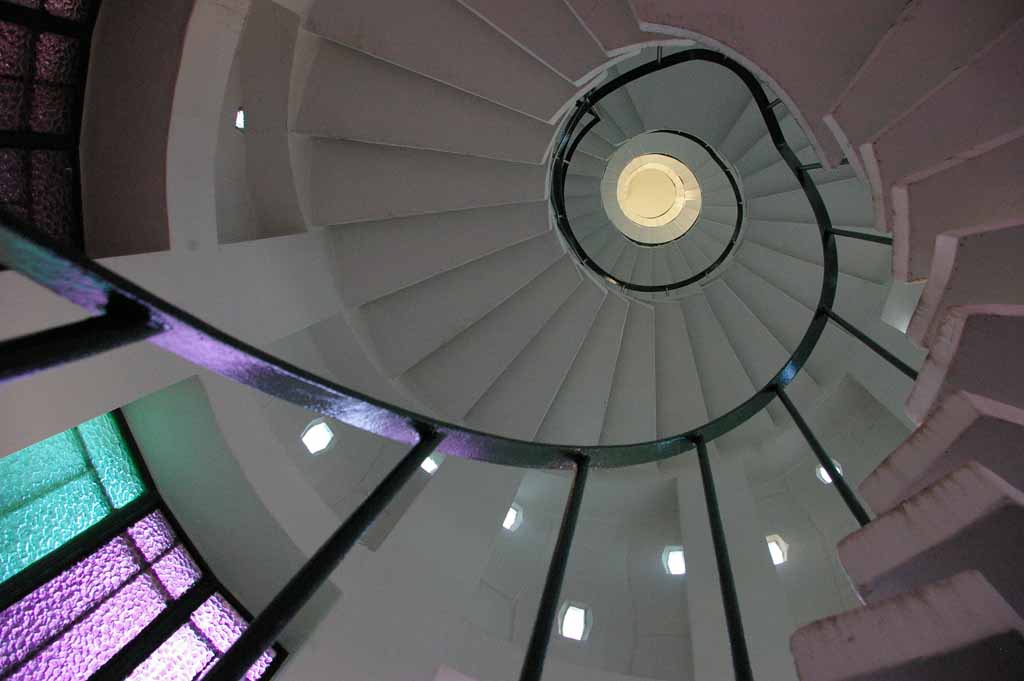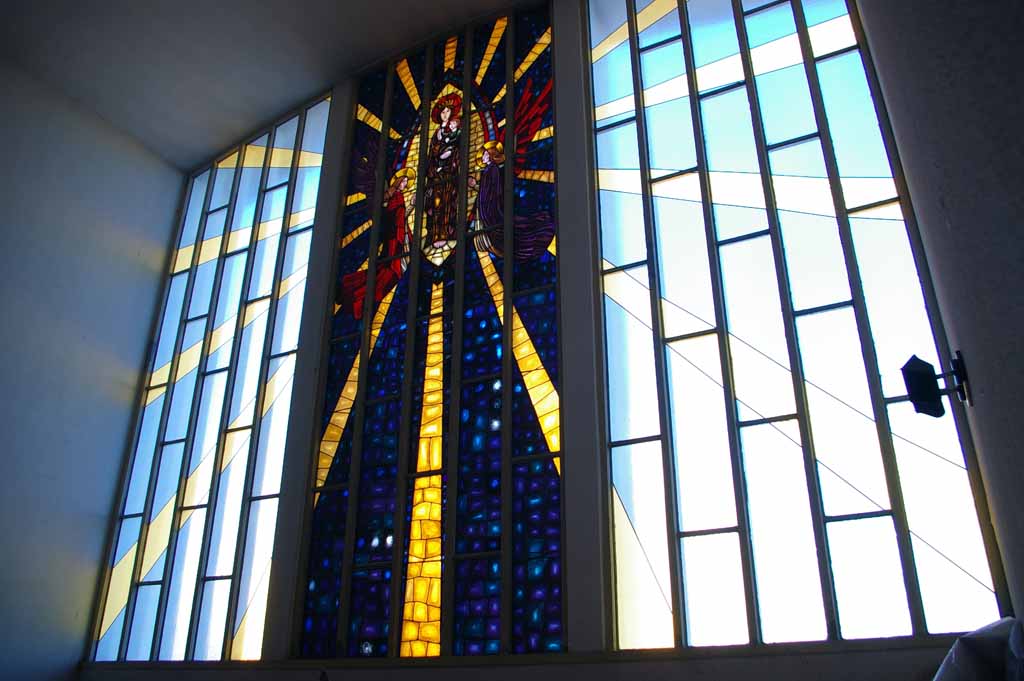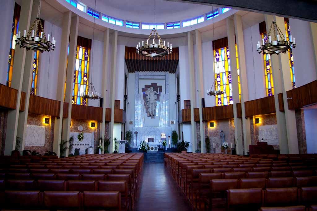 Já no interior, encontra-se uma nave única onde sobressaem grandiosos vitrais com uma rica gama policromada de tons, como o azul, o amarelo, o bege e o castanho, que conferem ao espaço uma luminosidade dinâmica e enérgica. Na sua totalidade, o conjunto apresenta-se equilibrado, sóbrio e bem proporcionado com uma ampla nave concêntrica, reforçando o conceito de reunião e de agregação.