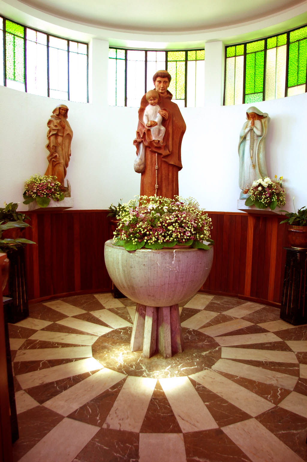 Originariamente, no guarda-vento da Igreja, e em paralelo com a torre sineira, do lado esquerdo encontrava-se o batistério. Ainda hoje se pode ver neste local a pia batismal, mas já sem a função sacramental, e sobre a qual assenta a imagem de Santo António e, à sua volta, outras imagens, todas da autoria de Irene Vilar.